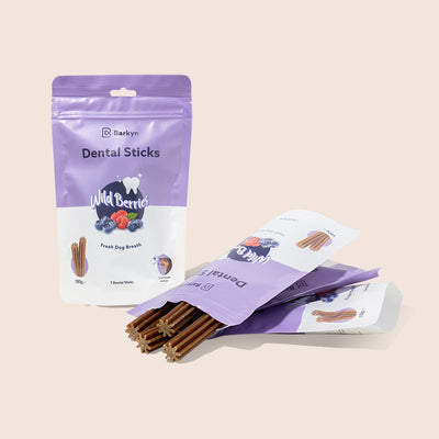 El Pack Aliento contiene productos con sabor a frutos rojos que mejoran la salud bucal de tu perro y refrescan su aliento.